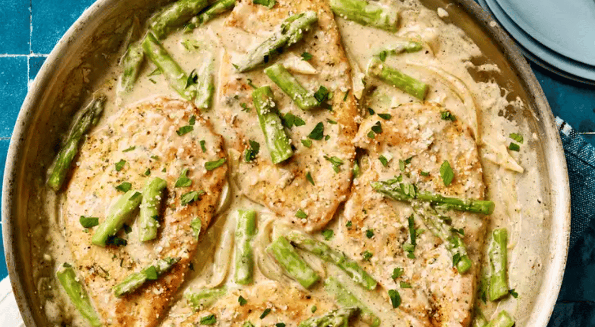 Cheesy Asparagus Chicken Cutlets: A creamy cheese sauce spiked with tender-crisp asparagus blankets chicken cutlets in this early-spring-inspired weeknight dinner. The asparagus can be swapped with other tender, snappy steamed veggies, like snap peas or green beans. Serve with fingerling or new potatoes for a starchy side to complement the sauce.