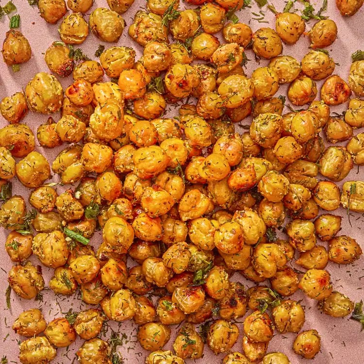 These ranch-flavored roasted chickpeas are a savory snack that delivers the familiar tangy-herb taste of ranch dressing.