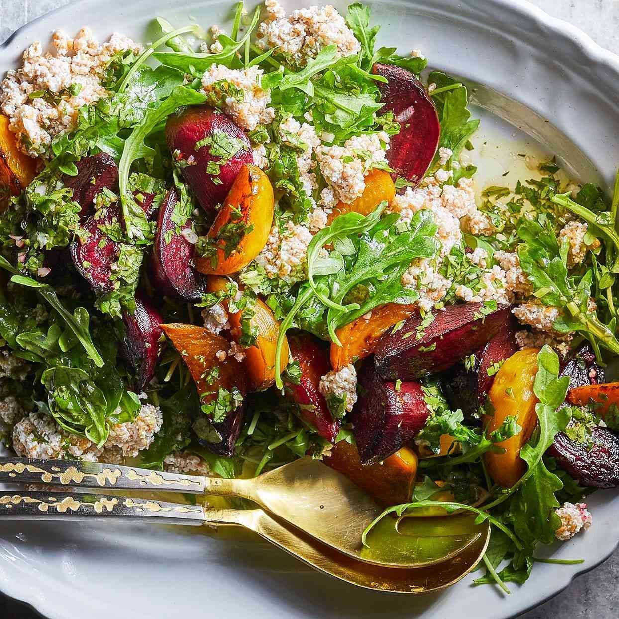 Charred Brussels, Beetroot & Bulgur Salad Recipe: To make Charred Brussels, Beetroot, and Bulgur Salad, roast Brussels sprouts and diced beetroot with olive oil and balsamic vinegar until tender, then mix with cooked bulgur and top with walnuts and feta cheese. This healthy, flavorful salad takes about 45 minutes to prepare and serves four people, offering a nutritious balance of fats, carbohydrates, and protein.